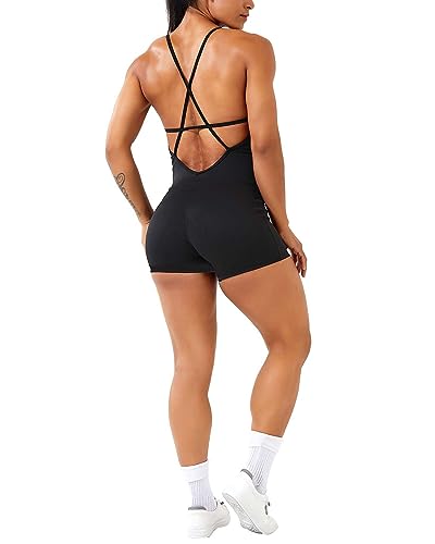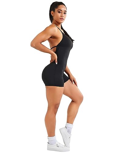 - Workout short onesie with sleeveless and backless design, scoop neck top with crisscross straps in the back, well construction for sports. Simple and comfortable, stylish sports wear. Shapes you well and outline your perfect curve.