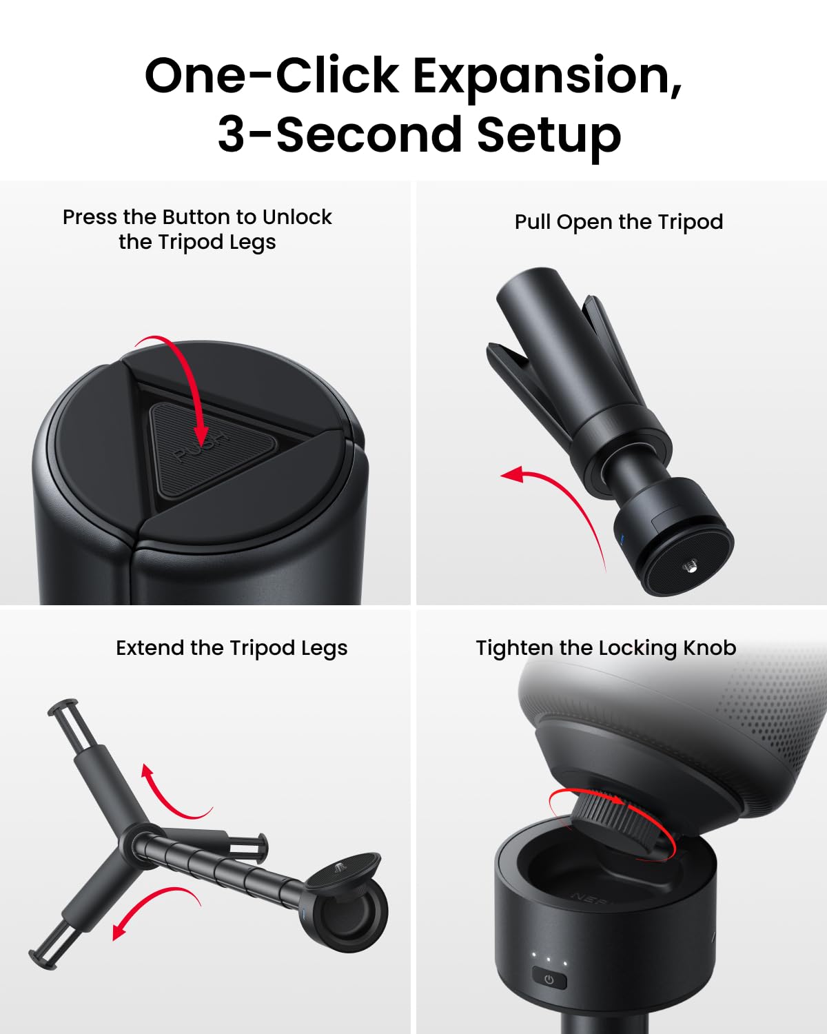 - Quick Setup: The tripod unfolds in one click, allowing you to adjust the height from 8.5 to 33 inches and set it up in just 3 seconds.