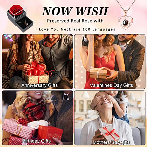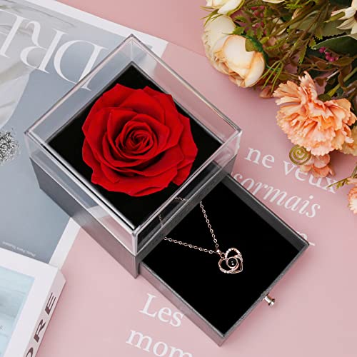 - Preserved Flower Rose with "I Love You" Necklace: This rose gift box comes with a heart-shaped pendant with a dazzling crystal, perfect for any occasion. Hidden within the pendant are 100 languages of "I Love You," revealing your love every time she wears it.The Valentines rose flower gifts is suitable for Mother's Day,Valentine's Day,Thanksgiving,Anniversary Gift for Her,Marriage Proposals,Birthday or other holiday occasions gift ideas.Make a really nice Valentines day gifts for women.