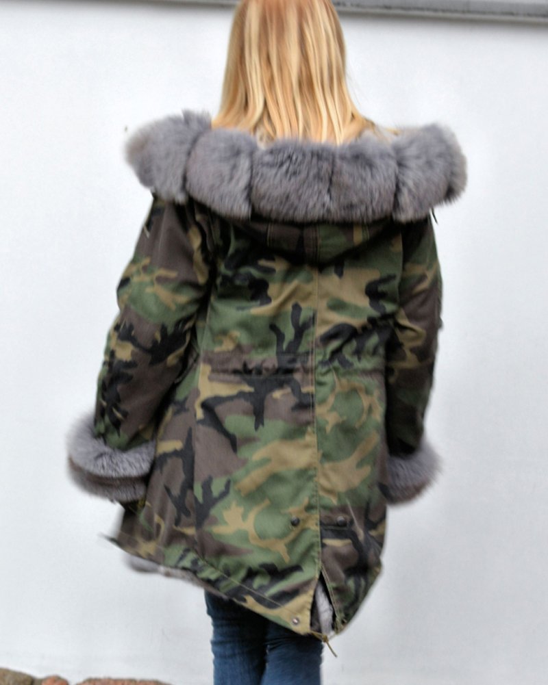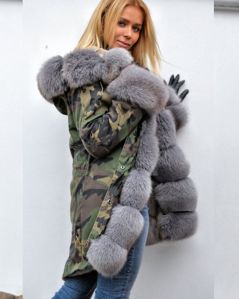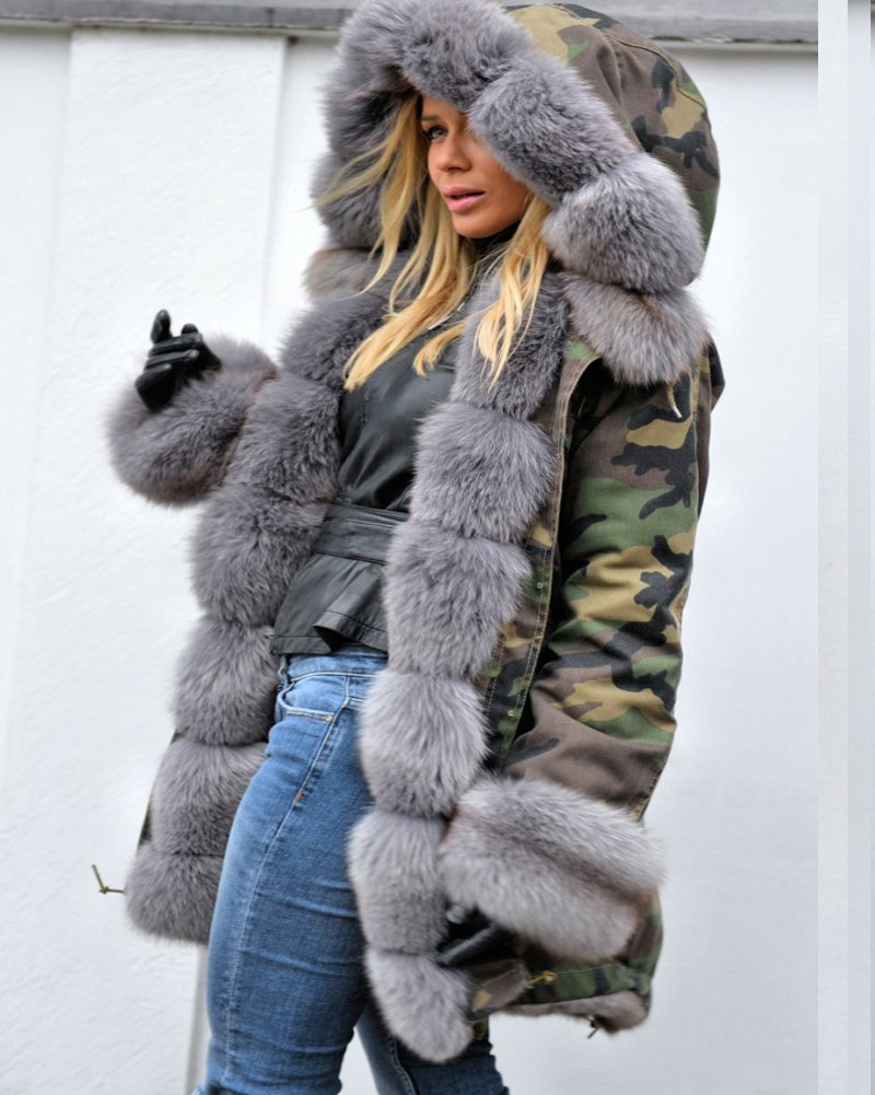 Women's Hooded Winter Coat, Green Camo with Grey Faux Fur
